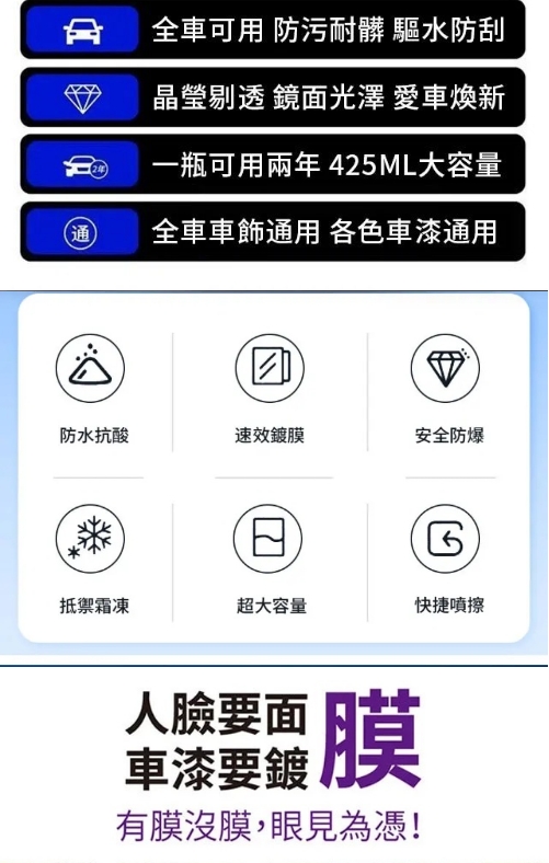 7分鐘前全台車友狂推NO.1的【納米汽車鍍膜液】一噴一擦變新車,鍍膜塗層長期保護車漆,灰塵、泥土、雨水一滴不沾! 限時特惠!! - 98%客戶選擇【特惠5入組】贈送汽車鍍膜毛巾5條 僅需 NT$1298
