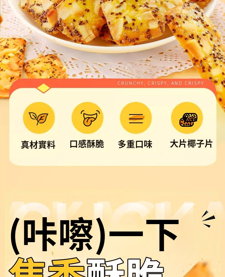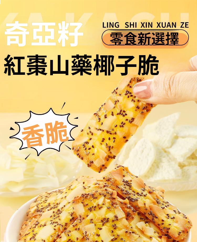 融合奇亞籽之高纖維、富含不飽和脂肪酸,紅棗補血益氣,山藥健脾益胃,椰子營養豐富。此薄脆美味可口,是健康零食佳選。無論代餐或平日享用,皆能為你提供充足能量,滋補身心。