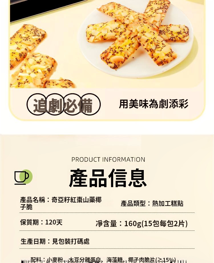 半小時前奇亞籽紅棗山藥椰子薄脆 - 【狂殺特賣】買二送二 箱裝 NT$1098